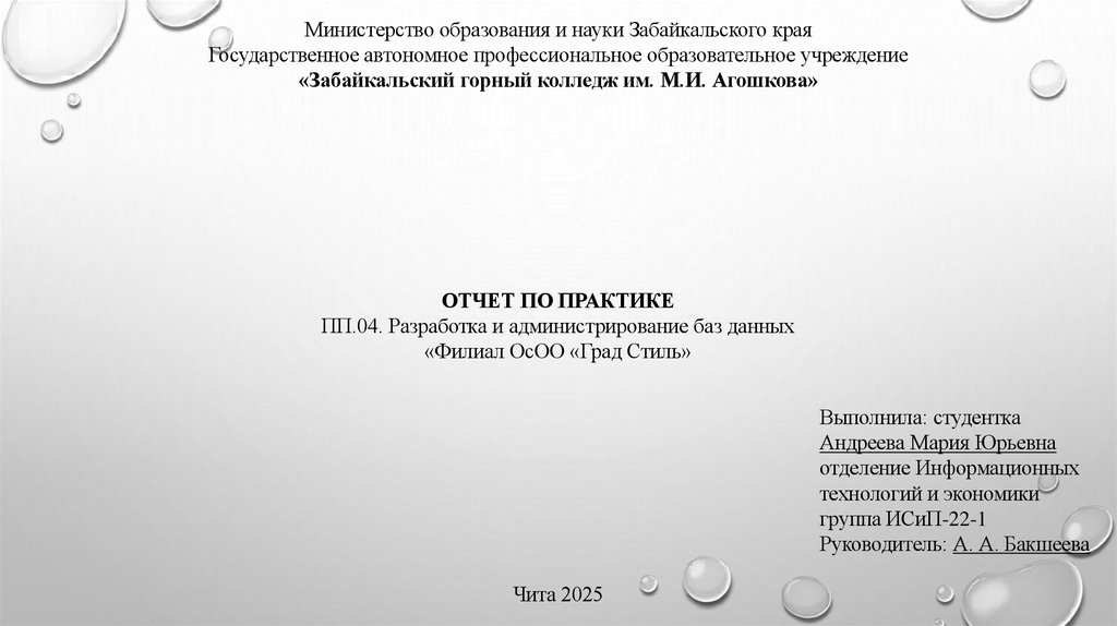 Разработка и администрирование баз данных «Филиал ОсОО «Град Стиль». Отчет по практике