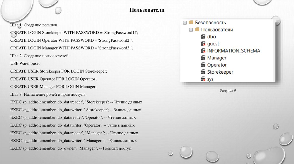 EXEC sp_addrolemember 'db_datawriter', ' Storekeeper'; -- Запись данных