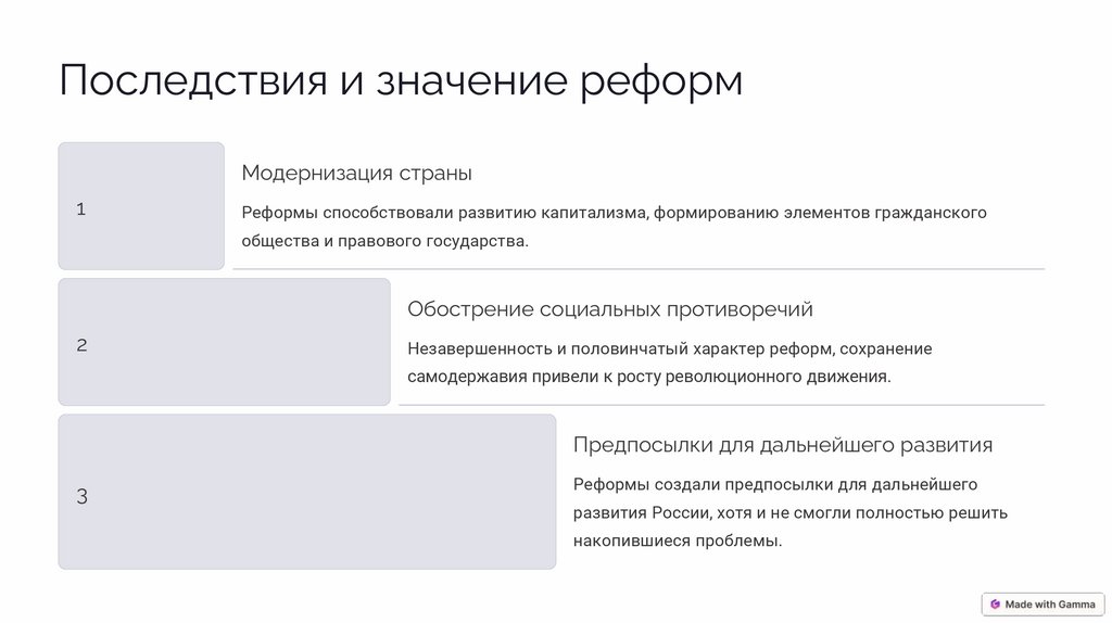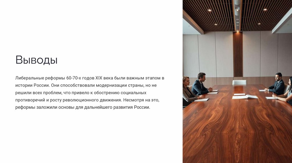 ВыводыЛиберальные реформы 60-70-х годов XIX века были важным этапом в