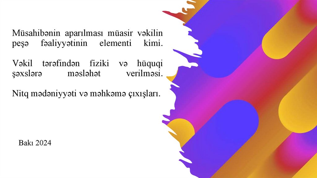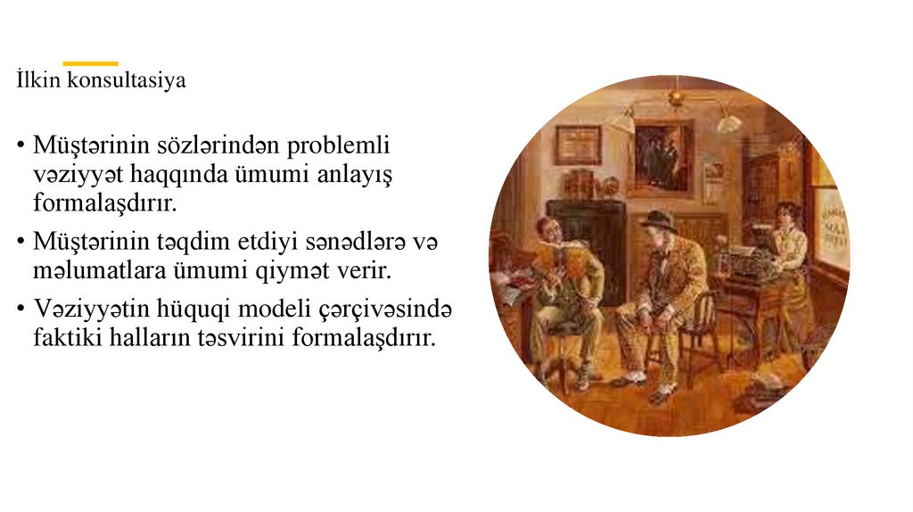 Müsahibənin aparılması müasir vəkilin peşə fəaliyyətinin elementi kimi.Vəkil tərəfindən fiziki və hüquqi şəxslərə məsləhət