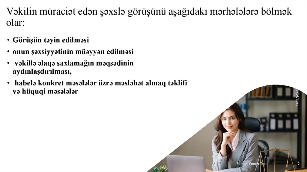 Vəkilin müraciət edən şəxslə görüşünü aşağıdakı mərhələlərə bölməkolar:
