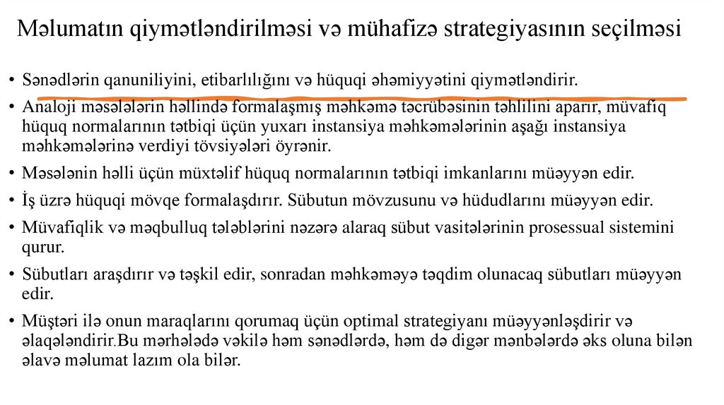 Məlumatın qiymətləndirilməsi və mühafizə strategiyasının seçilməsi• Sənədlərin qanuniliyini, etibarlılığını və hüquqi əhəmiyyətini qiymətləndirir.