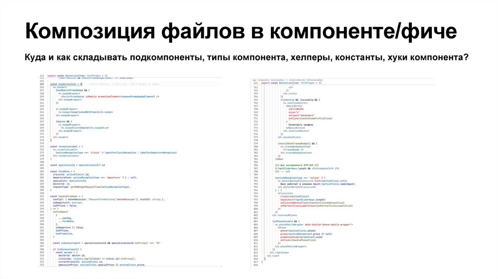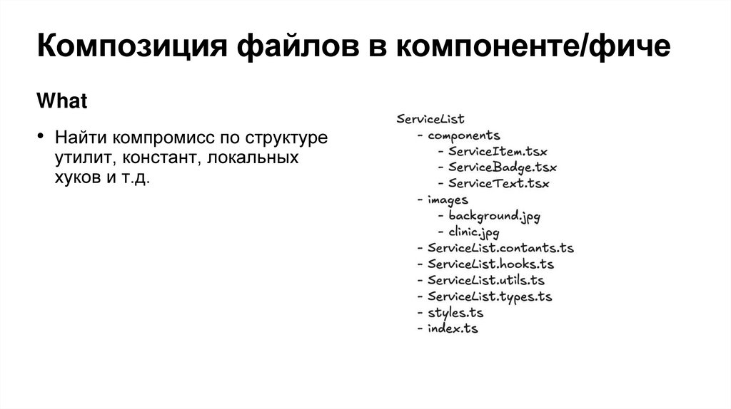 Композиция файлов в компоненте/фичеКуда и как складывать подкомпоненты, типы компонента, хелперы, константы, хуки компонента?