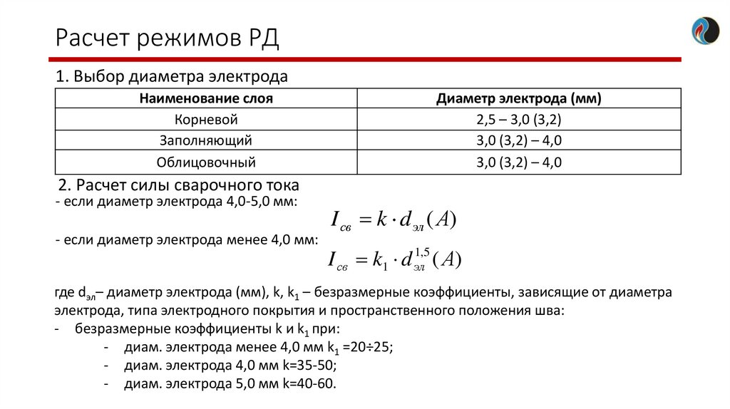 где dэл– диаметр электрода (мм), k, k1 – безразмерные коэффициенты, зависящие от диаметра