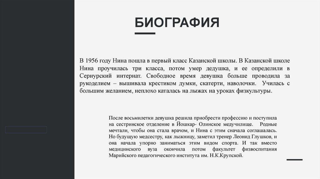 БИОГРАФИЯВ 1956 году Нина пошла в первый класс Казанской школы. В Казанской школе