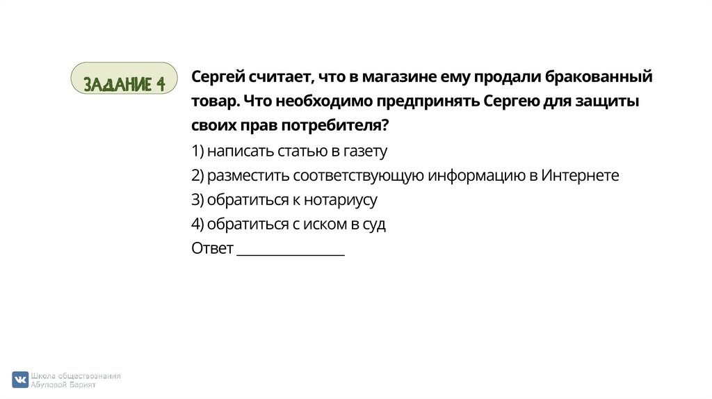 Сергей считает, что в магазине ему продали бракованныйтовар. Что необходимо предпринять Сергею для защиты