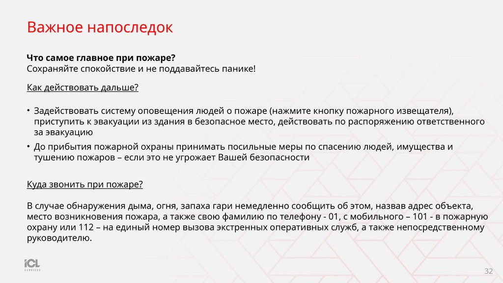 • Обнаружив пожар, немедленно о нем сообщить и до прибытия пожарной охраны принять посильные