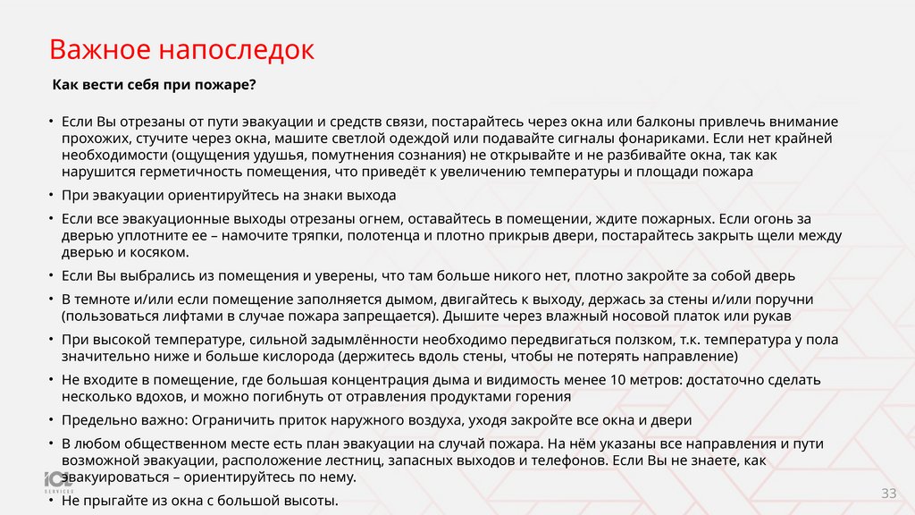 • Если все эвакуационные выходы отрезаны огнем, оставайтесь в помещении, ждите пожарных. Если огонь за
