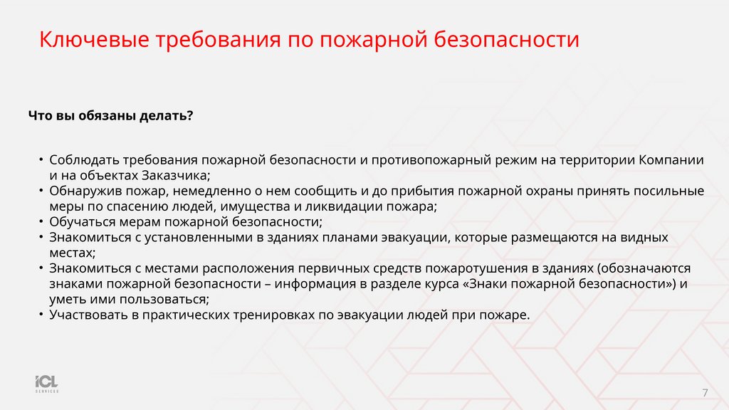 • Соблюдать требования пожарной безопасности и противопожарный режим на территории Компании