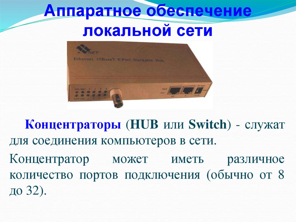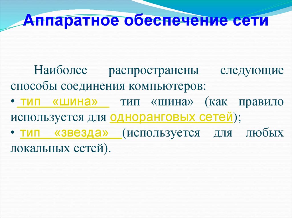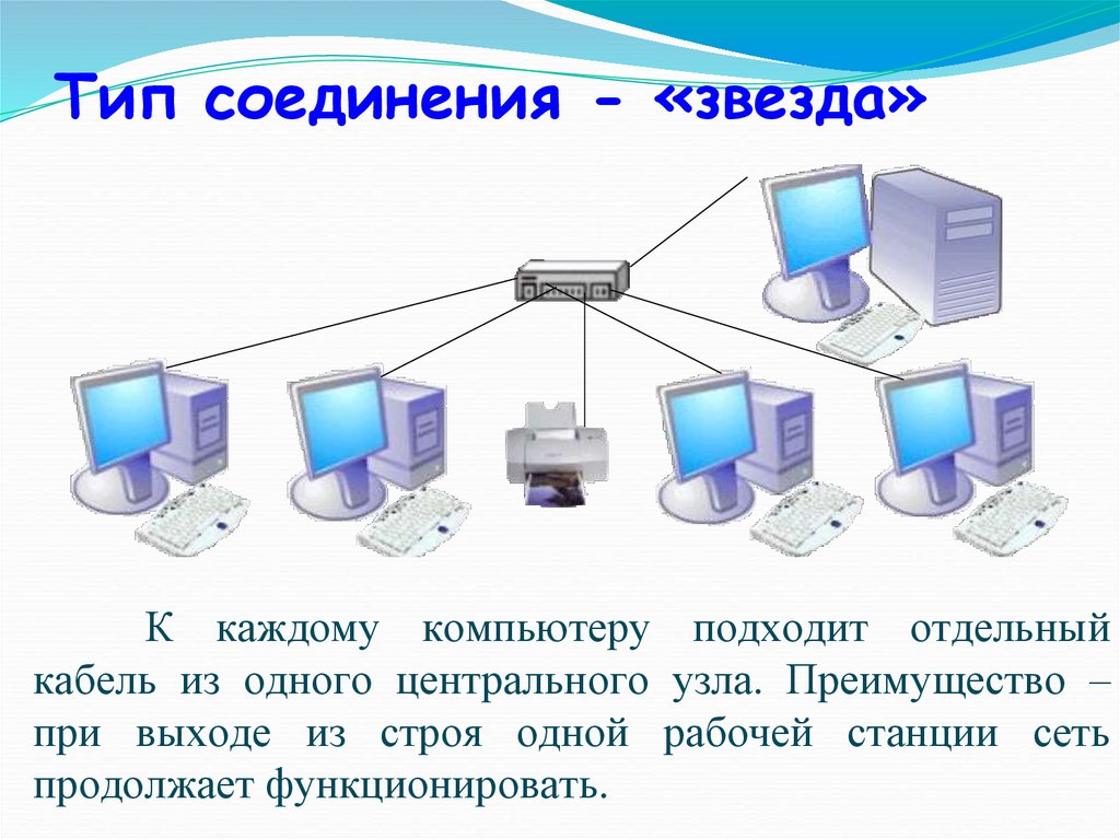 Тип соединения - «звезда»К каждому компьютеру подходит отдельный