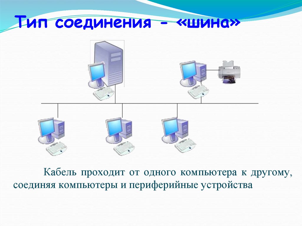 Тип соединения - «шина»Кабель проходит от одного компьютера к другому,