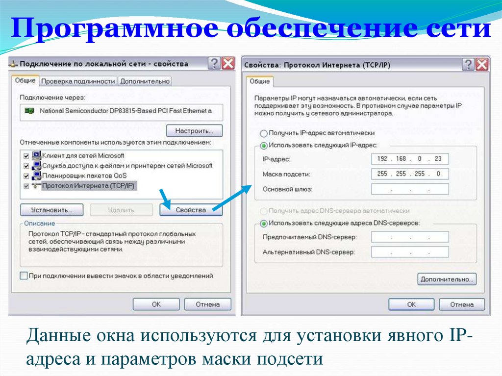 Программное обеспечение сетиДанные окна используются для установки явного IPадреса и параметров маски подсети