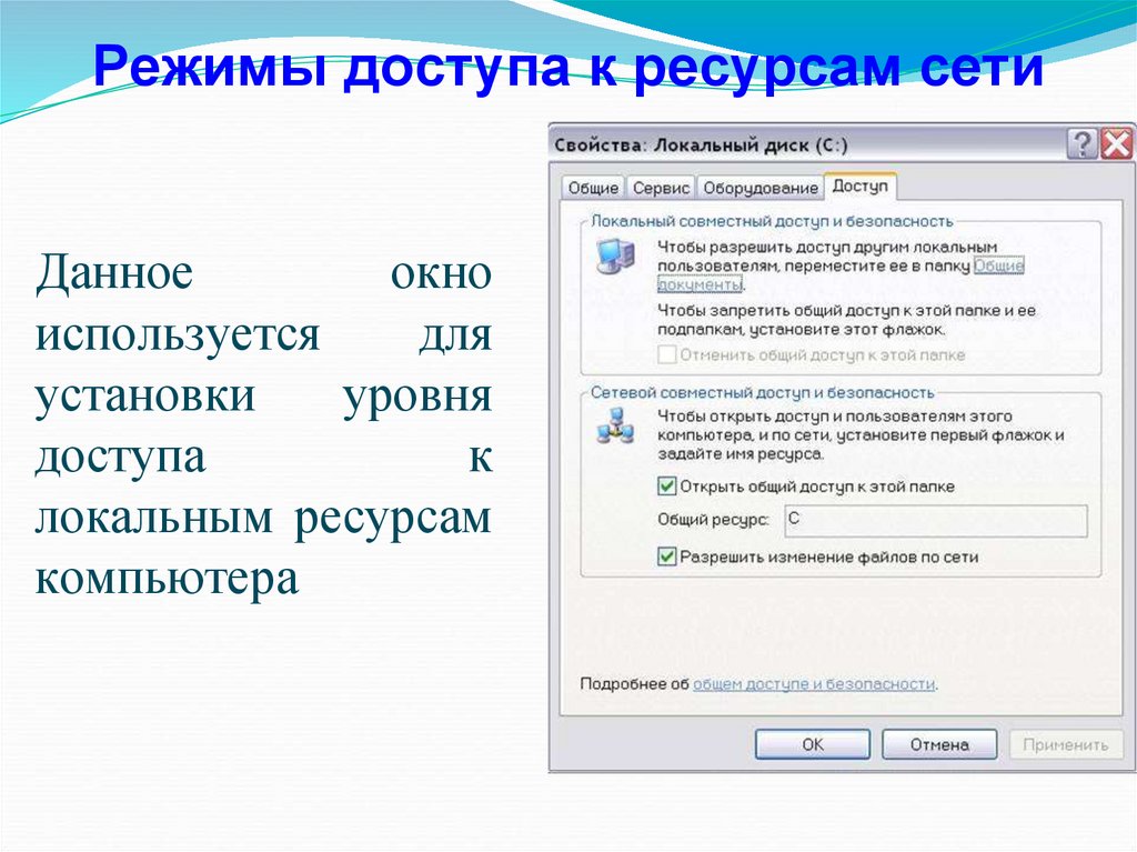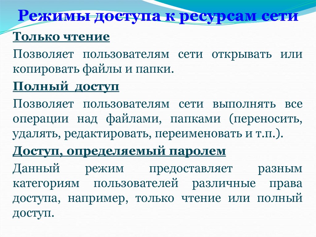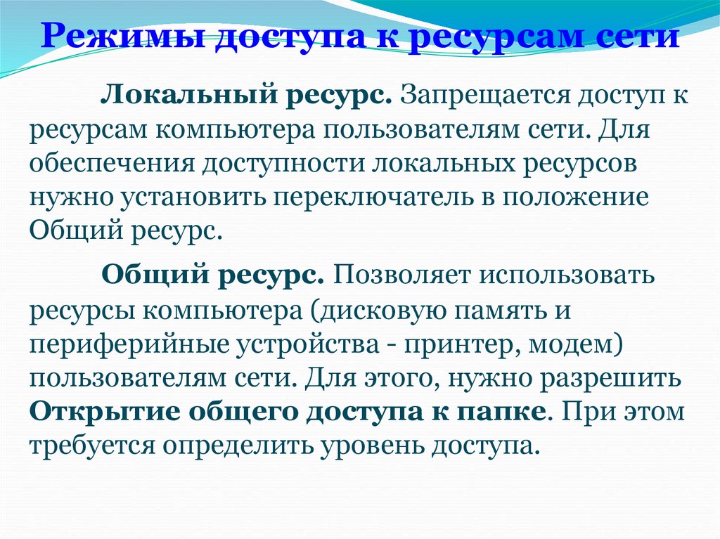 Режимы доступа к ресурсам сетиЛокальный ресурс. Запрещается доступ к