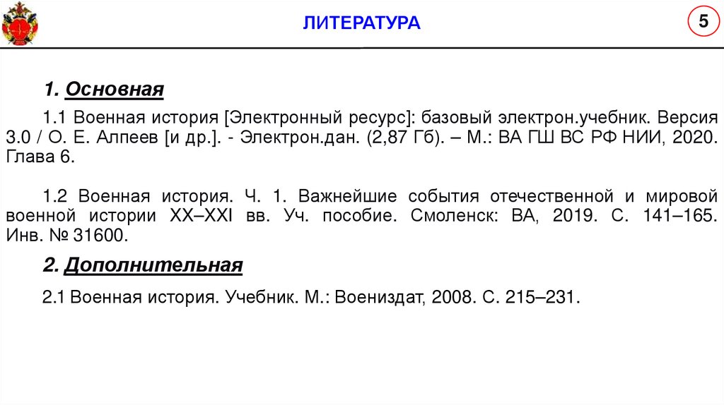 2.1 Военная история. Учебник. М.: Воениздат, 2008. С. 215–231.