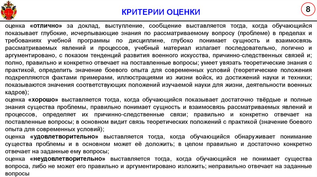 поставленные вопросы; в основном видит связь теоретических положений с практикой (значение боевого