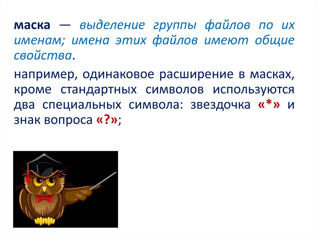 маска — выделение группы файлов по ихименам; имена этих файлов имеют общие