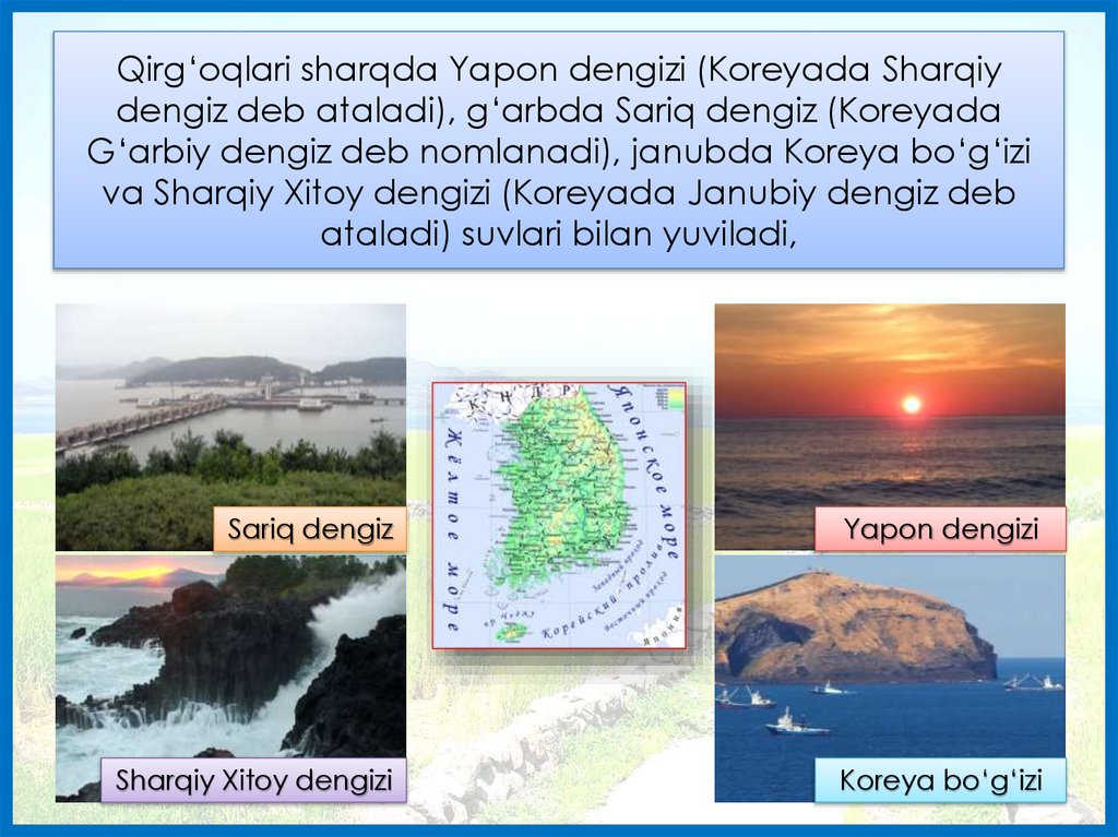 Qirg‘oqlari sharqda Yapon dengizi (Koreyada Sharqiydengiz deb ataladi), g‘arbda Sariq dengiz (Koreyada
