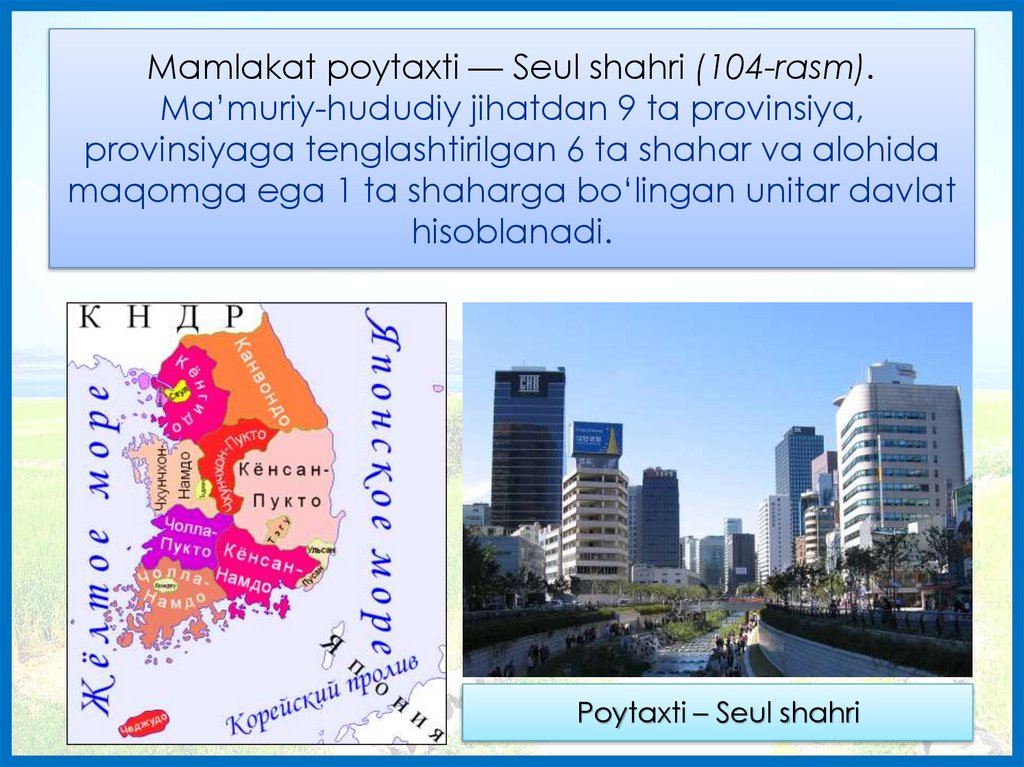 Mamlakat poytaxti — Seul shahri (104-rasm).Ma’muriy-hududiy jihatdan 9 ta provinsiya,