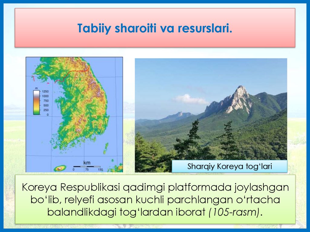 Tabiiy sharoiti va resurslari.Sharqiy Koreya tog‘lari