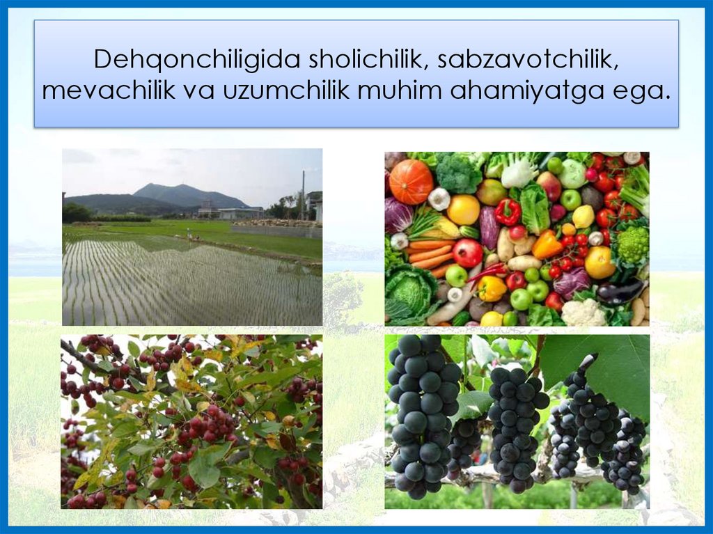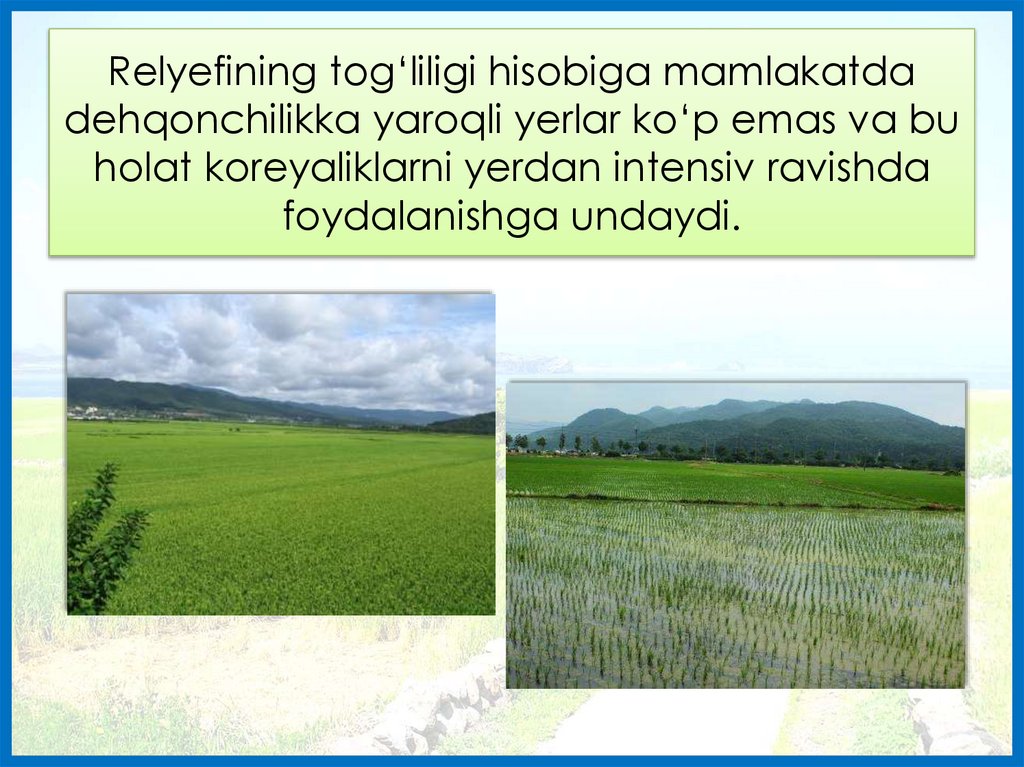 Relyefining tog‘liligi hisobiga mamlakatdadehqonchilikka yaroqli yerlar ko‘p emas va bu