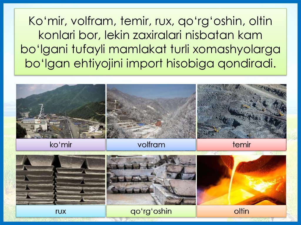 Ko‘mir, volfram, temir, rux, qo‘rg‘oshin, oltinkonlari bor, lekin zaxiralari nisbatan kam