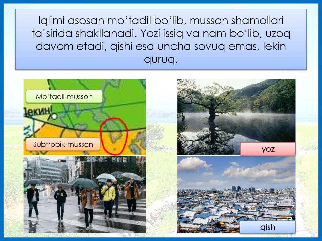 Iqlimi asosan mo‘tadil bo‘lib, musson shamollarita’sirida shakllanadi. Yozi issiq va nam bo‘lib, uzoq