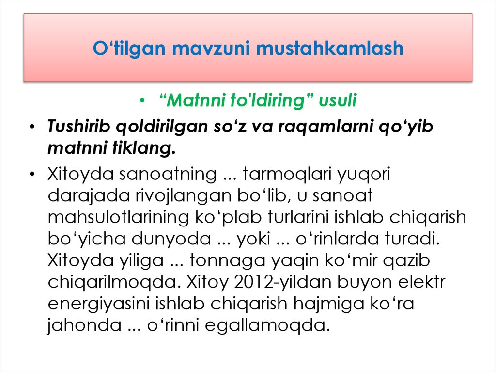 O‘tilgan mavzuni mustahkamlash• “Matnni to'ldiring” usuli