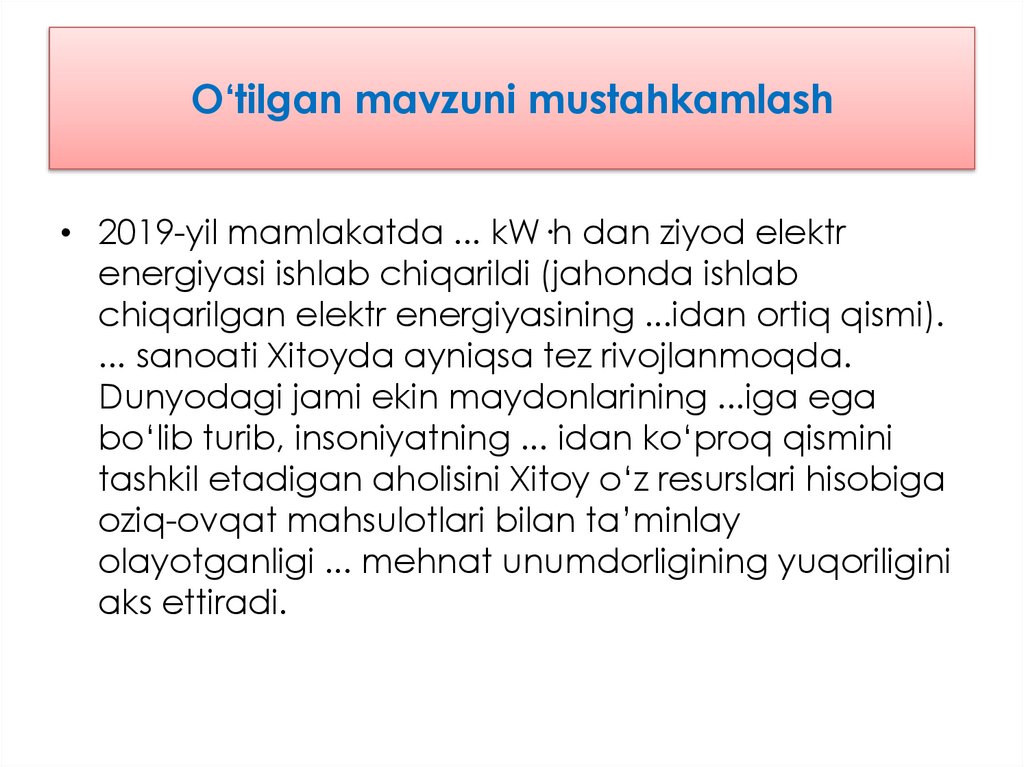 O‘tilgan mavzuni mustahkamlash• 2019-yil mamlakatda ... kW·h dan ziyod elektr