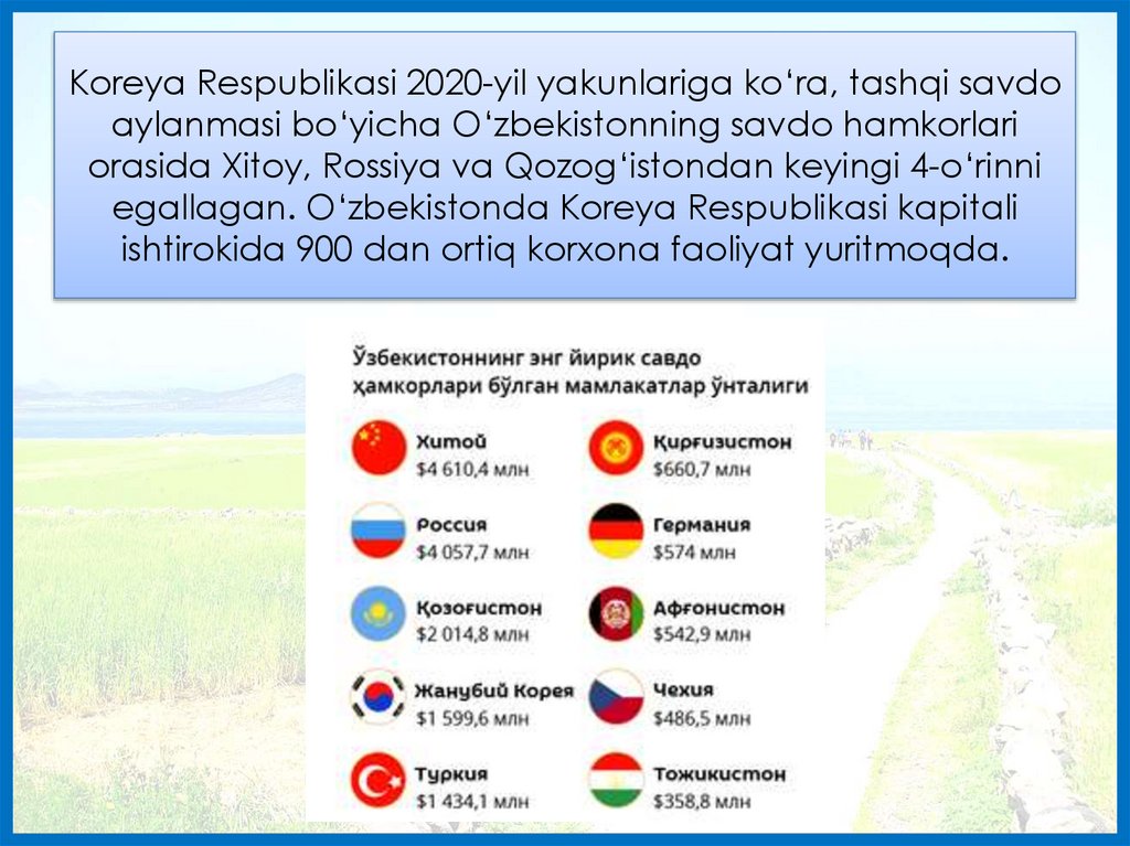 Koreya Respublikasi 2020-yil yakunlariga ko‘ra, tashqi savdoaylanmasi bo‘yicha O‘zbekistonning savdo hamkorlari