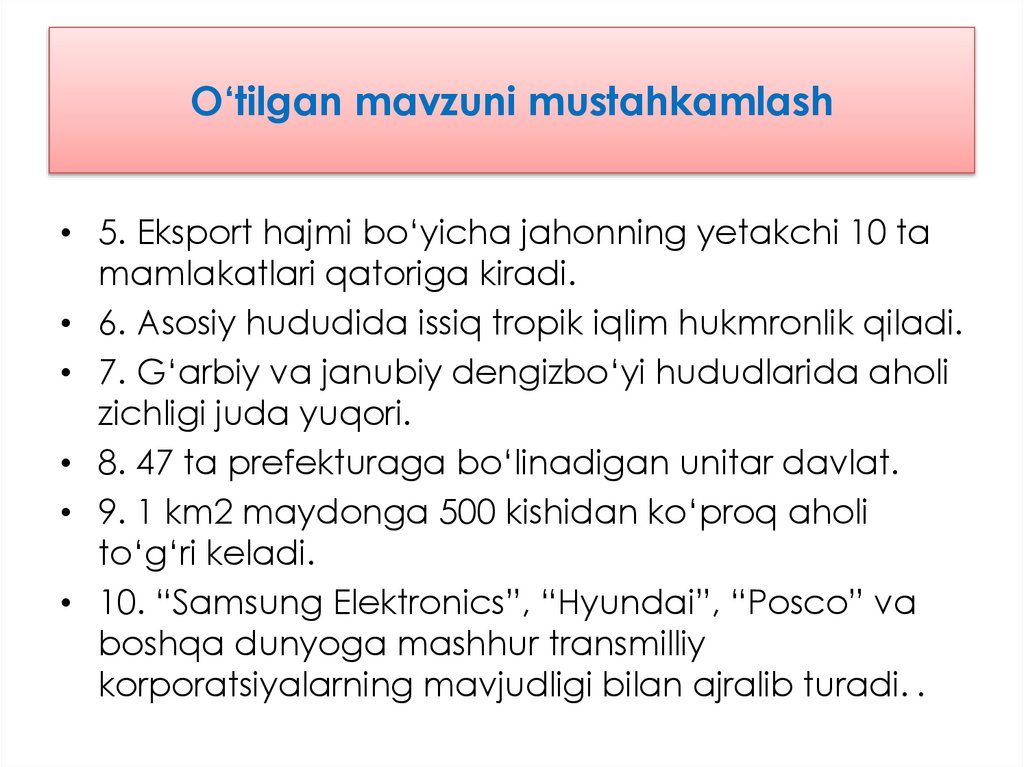 O‘tilgan mavzuni mustahkamlash• 5. Eksport hajmi bo‘yicha jahonning yetakchi 10 ta