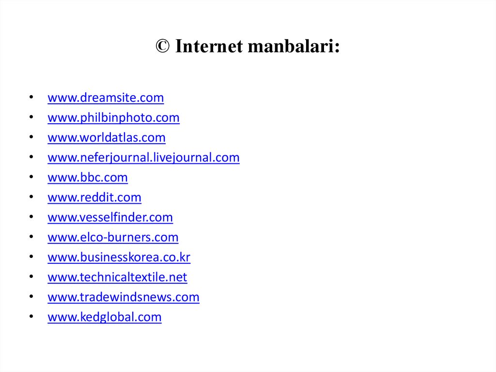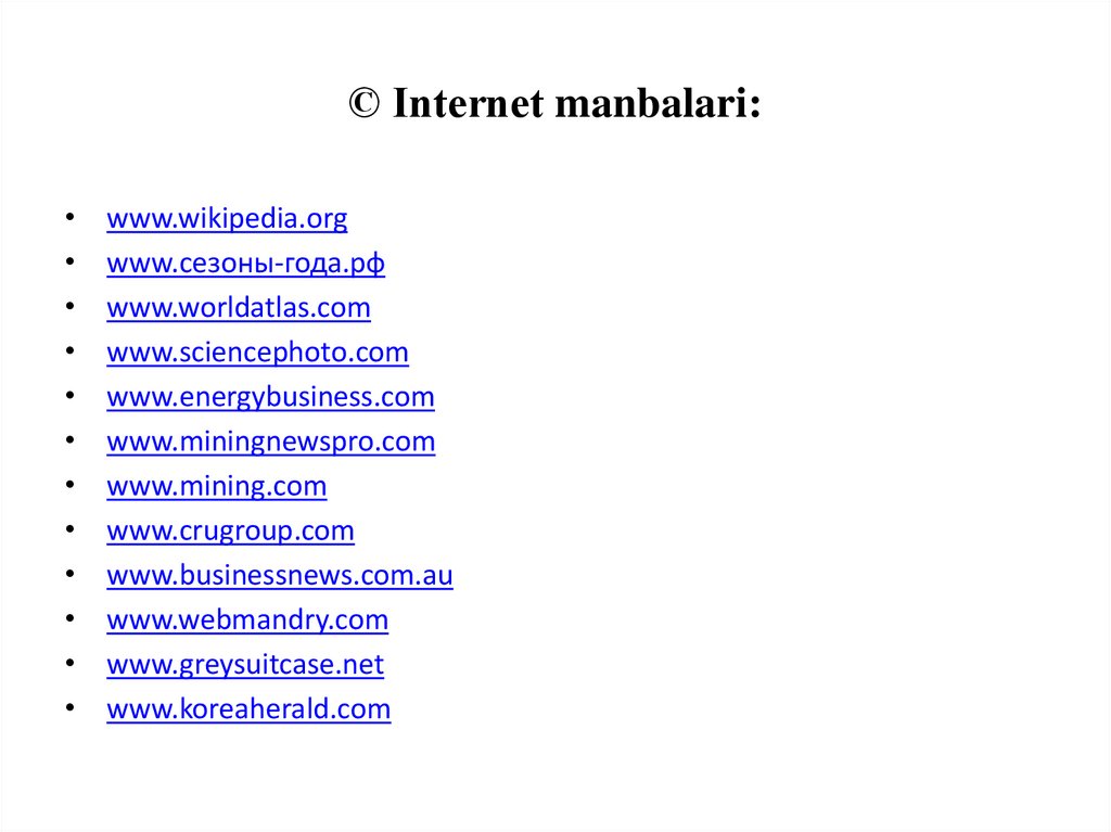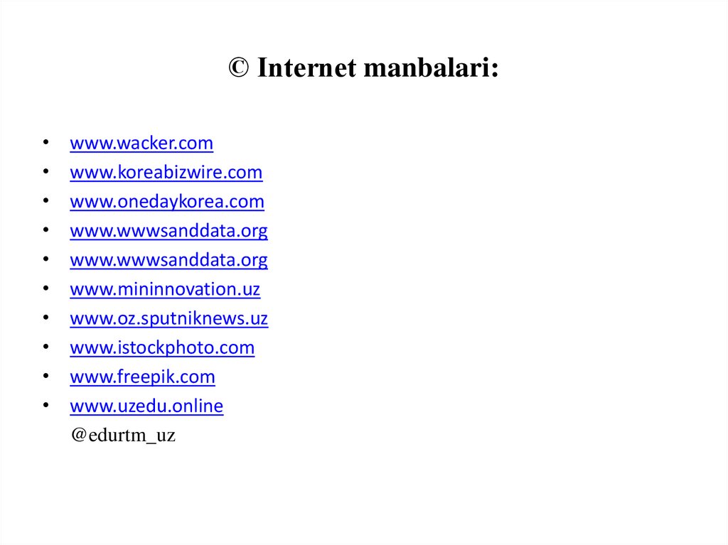 © Foydalanilgan adabiyotlar:• V. N. Fedorko, N. I. Safarova, J. A. Ismatov, E. Y. Nazaraliyeva