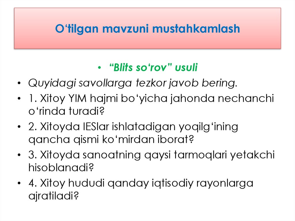 O‘tilgan mavzuni mustahkamlash• “Blits so‘rov” usuli