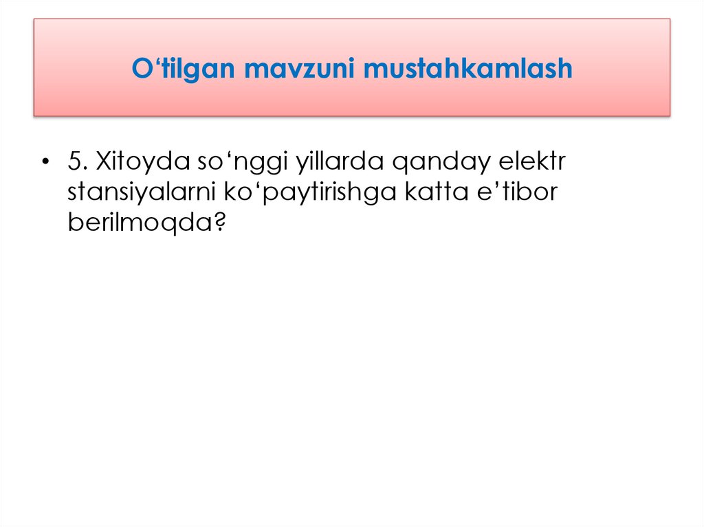 O‘tilgan mavzuni mustahkamlash• 5. Xitoyda so‘nggi yillarda qanday elektr