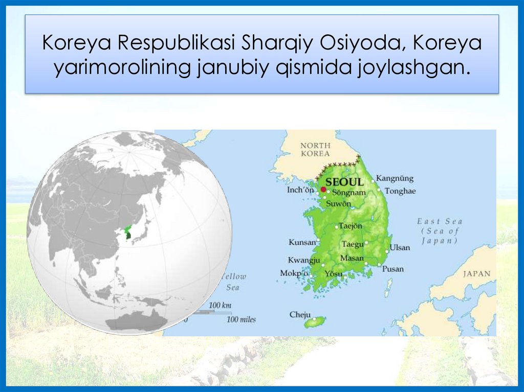 Koreya Respublikasi Sharqiy Osiyoda, Koreyayarimorolining janubiy qismida joylashgan.