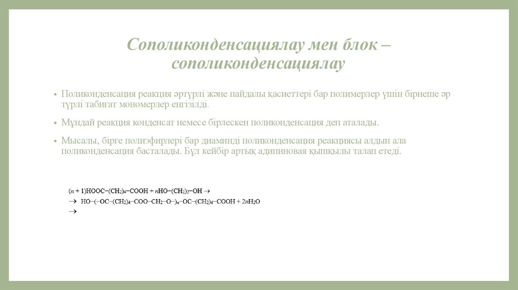 • Мұндай реакция конденсат немесе бірлескен поликонденсация деп аталады.