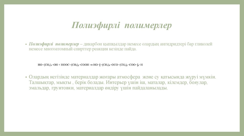 Полиэфирлі полимерлер• Полиэфирлі полимерлер – дикарбон қышқылдар немесе олардың ангидридтерi бар гликолей