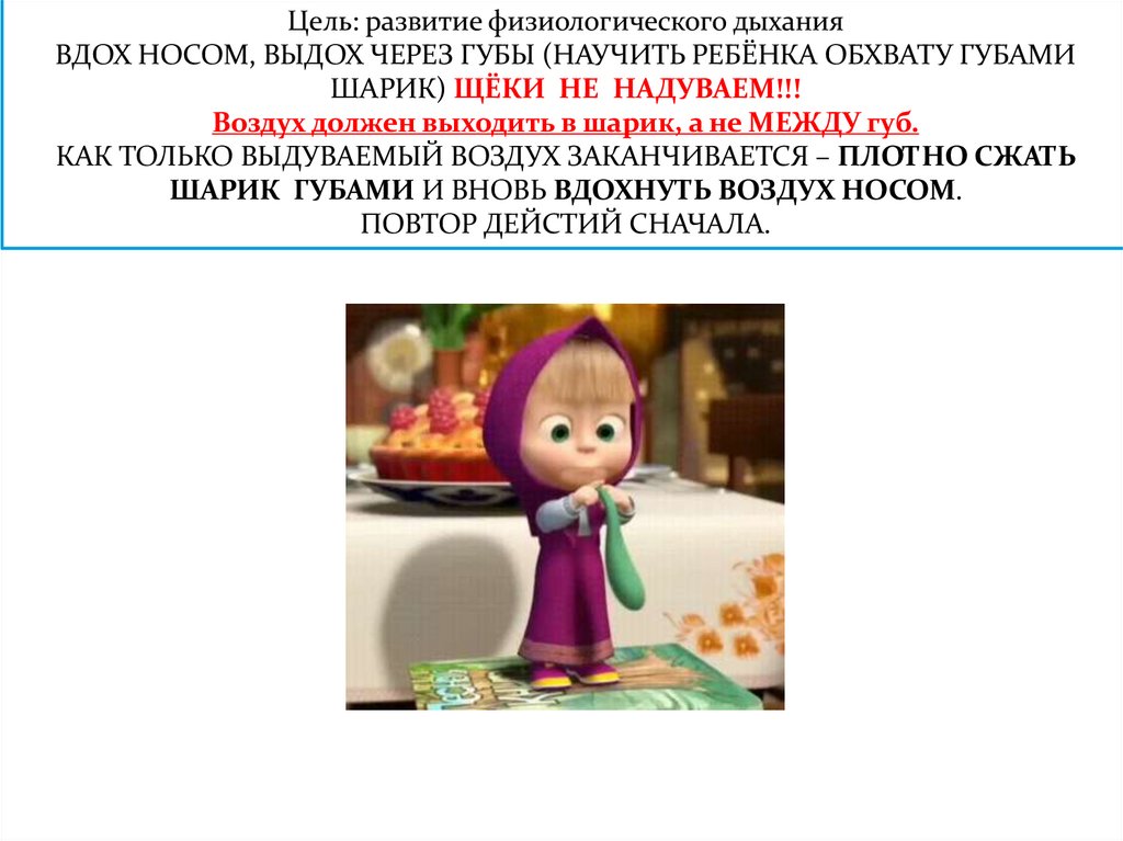 Цель: развитие физиологического дыханияВДОХ НОСОМ, ВЫДОХ ЧЕРЕЗ ГУБЫ (НАУЧИТЬ РЕБЁНКА ОБХВАТУ ГУБАМИ