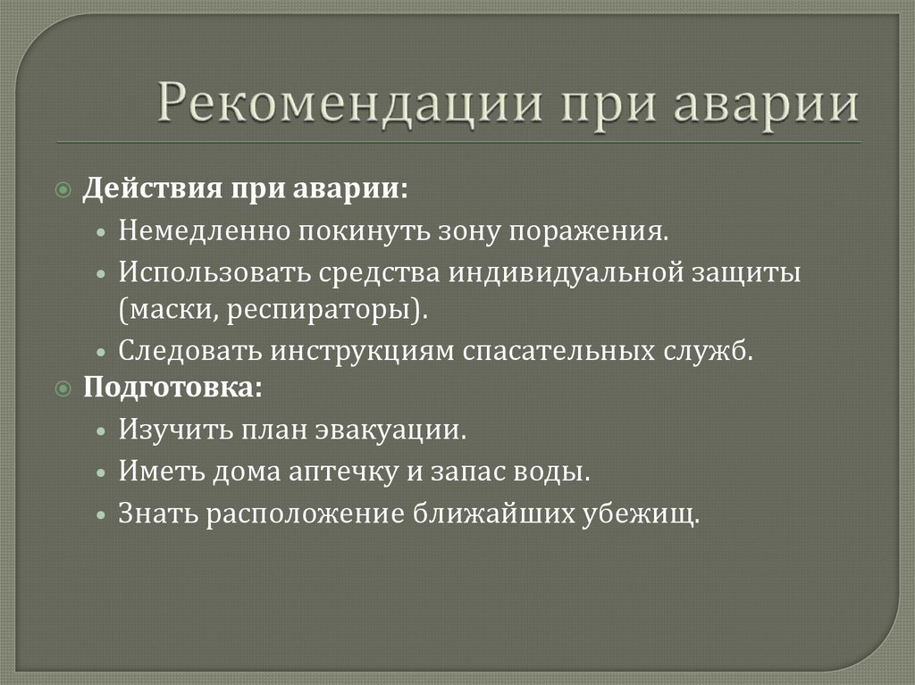Действия при аварии:• Немедленно покинуть зону поражения.