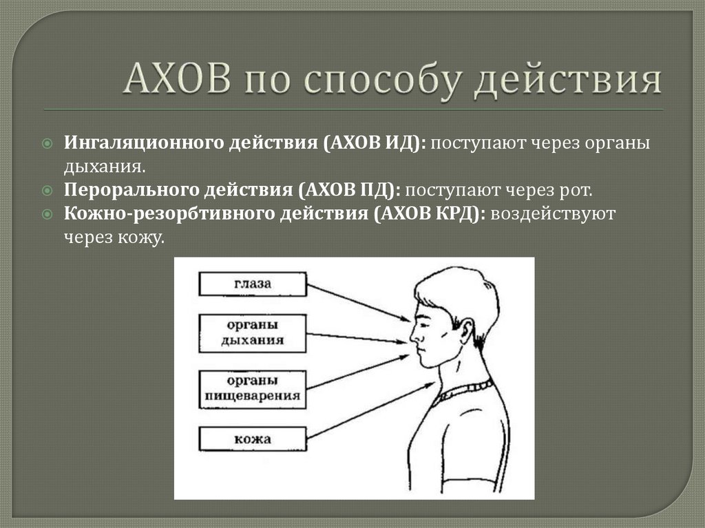 Ингаляционного действия (АХОВ ИД): поступают через органыдыхания.