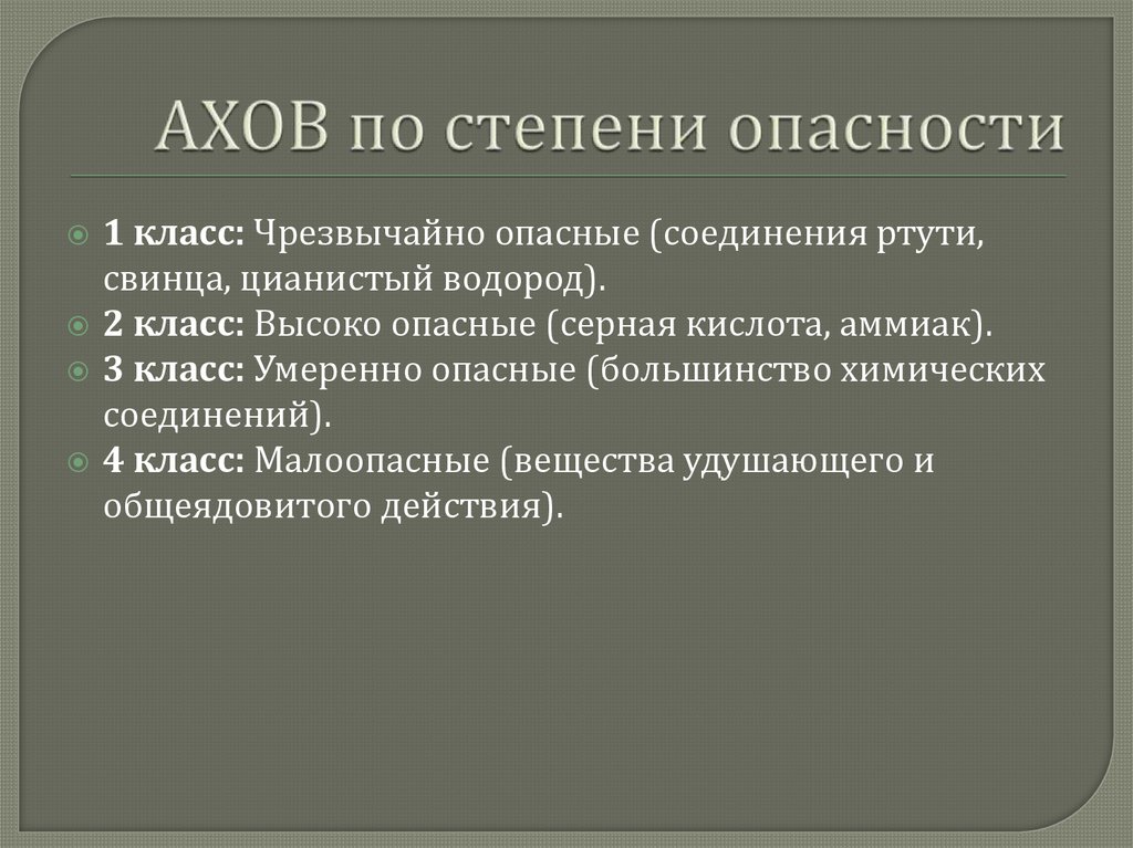 1 класс: Чрезвычайно опасные (соединения ртути,свинца, цианистый водород).