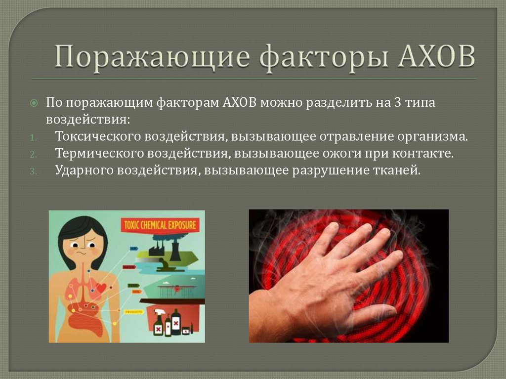 По поражающим факторам АХОВ можно разделить на 3 типавоздействия: