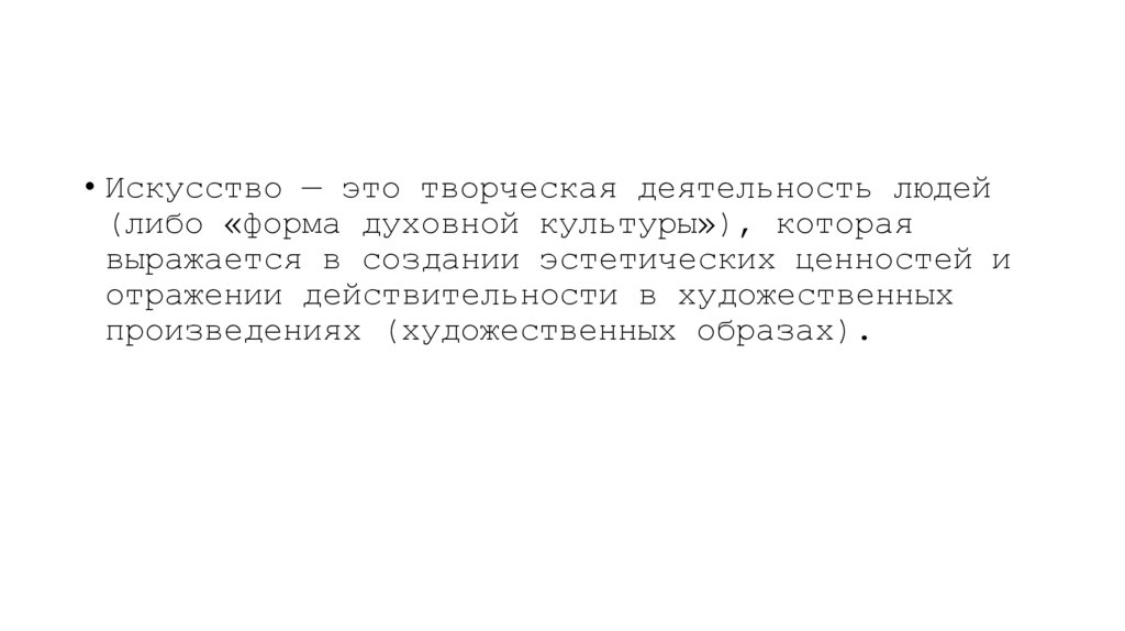 • Искусство — это творческая деятельность людей(либо «форма духовной культуры»), которая