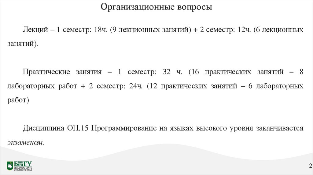 Организационные вопросыЛекций – 1 семестр: 18ч. (9 лекционных занятий) + 2 семестр: 12ч. (6 лекционных