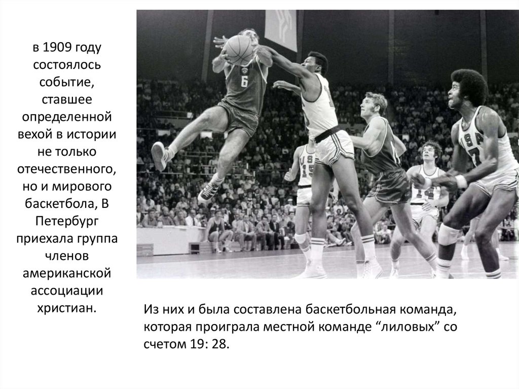 Датой зарождения баскетбола в России считается1906г. Место рождения - Петербург, спортивное