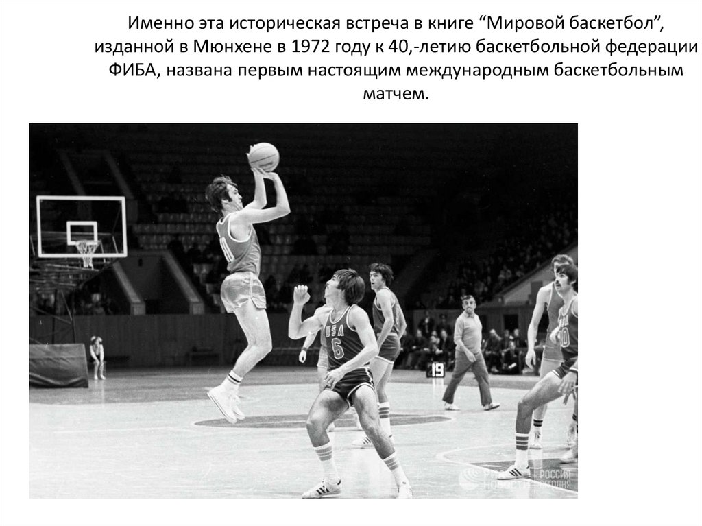 Именно эта историческая встреча в книге “Мировой баскетбол”,изданной в Мюнхене в 1972 году к 40,-летию баскетбольной федерации