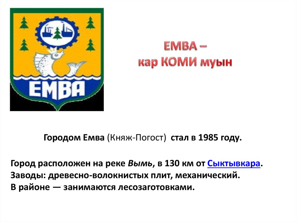 Городом Емва (Княж-Погост) стал в 1985 году.Город расположен на реке Вымь, в 130 км от Сыктывкара.