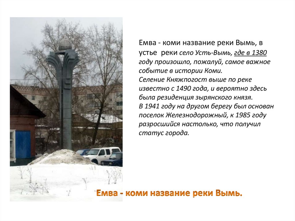 Город получил свое название от местного названия рекиВымь – Емва («священная вода»).