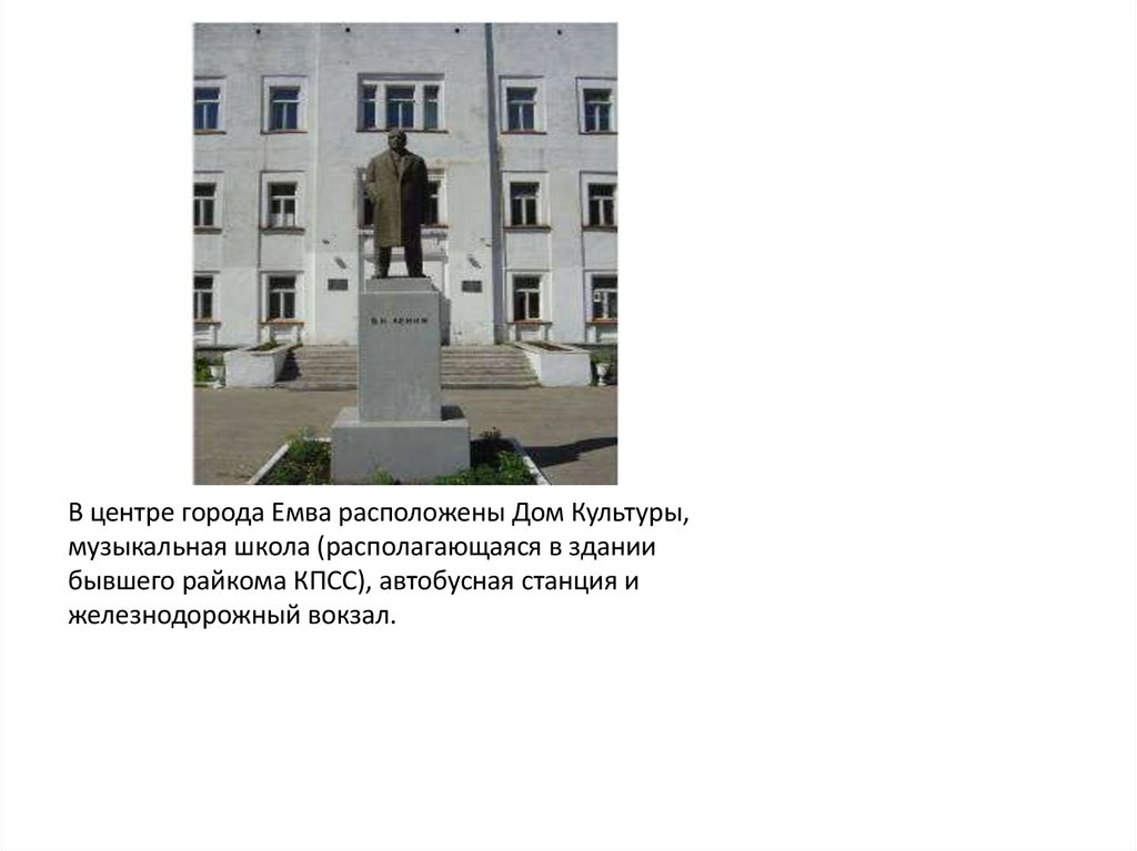 В центре города Емва расположены Дом Культуры,музыкальная школа (располагающаяся в здании