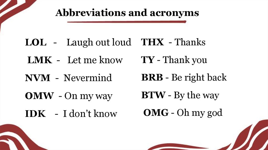 Abbreviations and acronymsLOL - Laugh out loud THX - Thanks