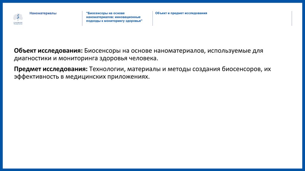 Объект исследования: Биосенсоры на основе наноматериалов, используемые для